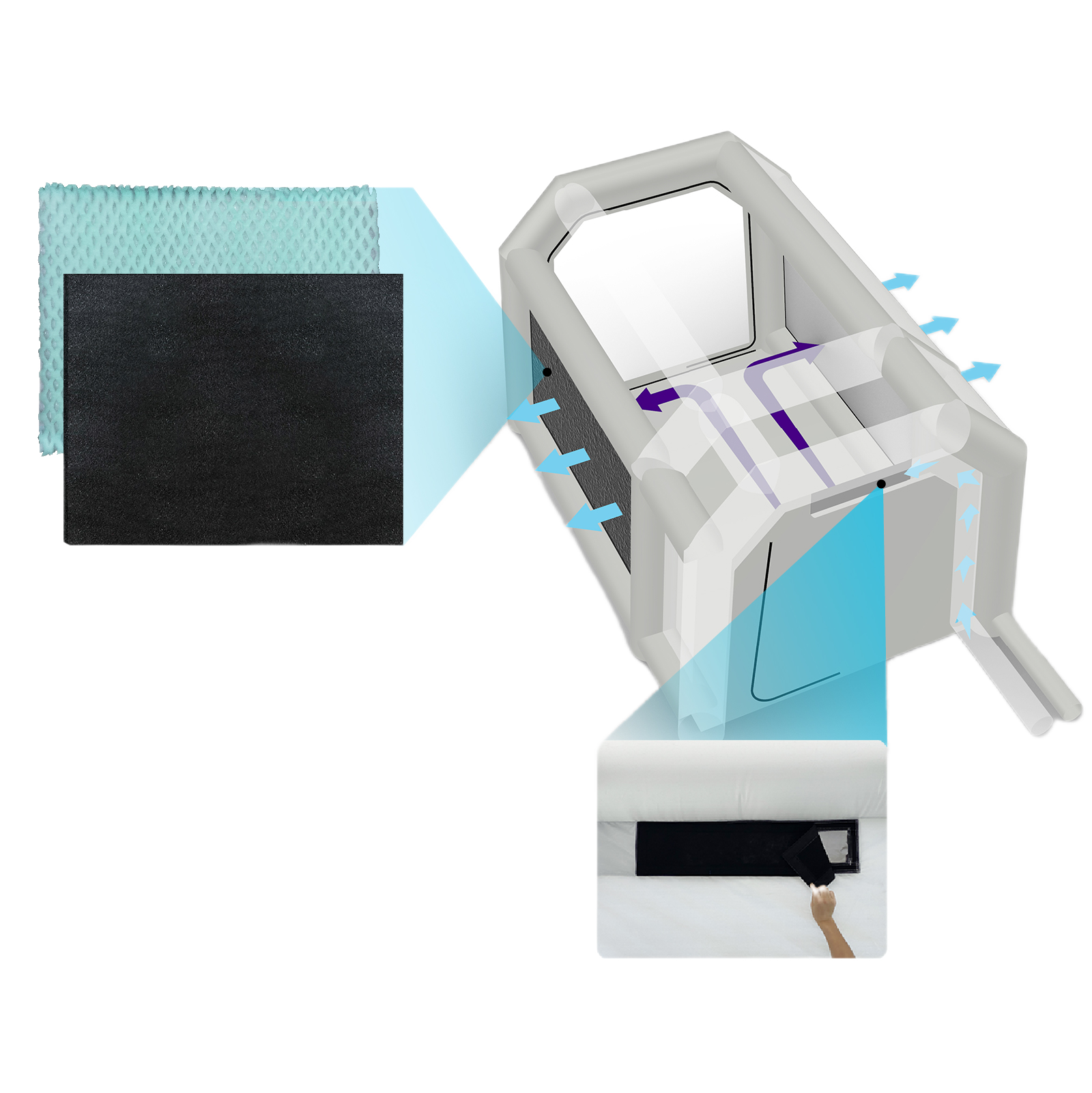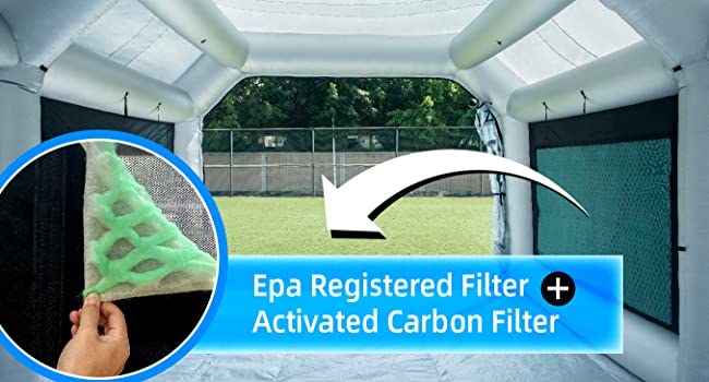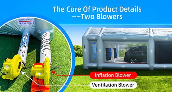 One blower to inflate the booth, while the other keeps the air circulating and makes the environment clean and safe. The paint booth sets up in minutes.