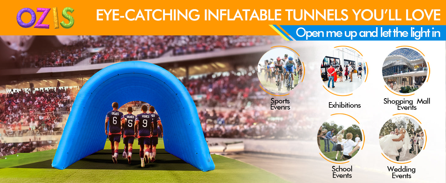 - 【Wider Inflatable Columns for Enhanced Stability】Unlike other inflatable tunnel tents on the market, the OZIS inflatable tunnel entrance features wider inflatable columns, providing greater stability than other tunnels. The top and bottom are equipped with metal reinforcement rings and ropes to further enhance stability. You can also choose to add sandbags or nails for additional reinforcement.