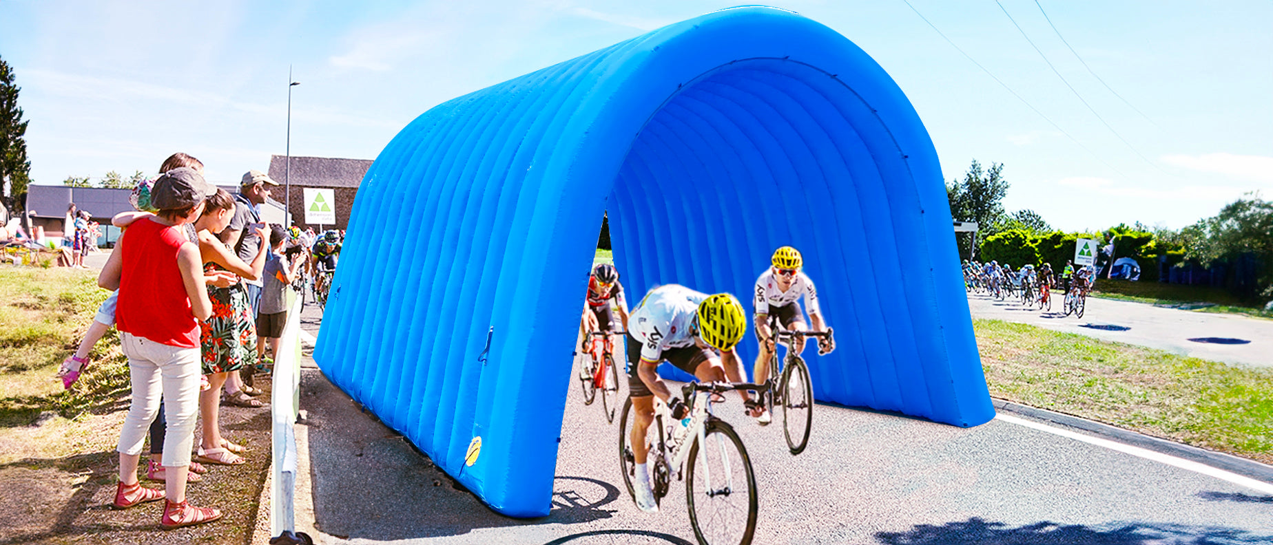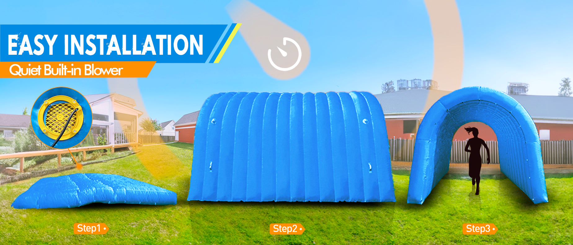 - 【Wide Range of Applications】When inflated, the approximate size is 10x10x9 feet, with an entrance dimension of 7.05 feet wide by 8.5 feet high. It is commonly used for events, exhibitions, promotions, inflatable games, obstacle courses, streets, stores, supermarkets, and schools. You will receive: an inflatable tunnel (with a 250W external blower), 4 ropes, 8 nails, 1 blue patch cloth, 1 storage bag, and 4 sandbags.