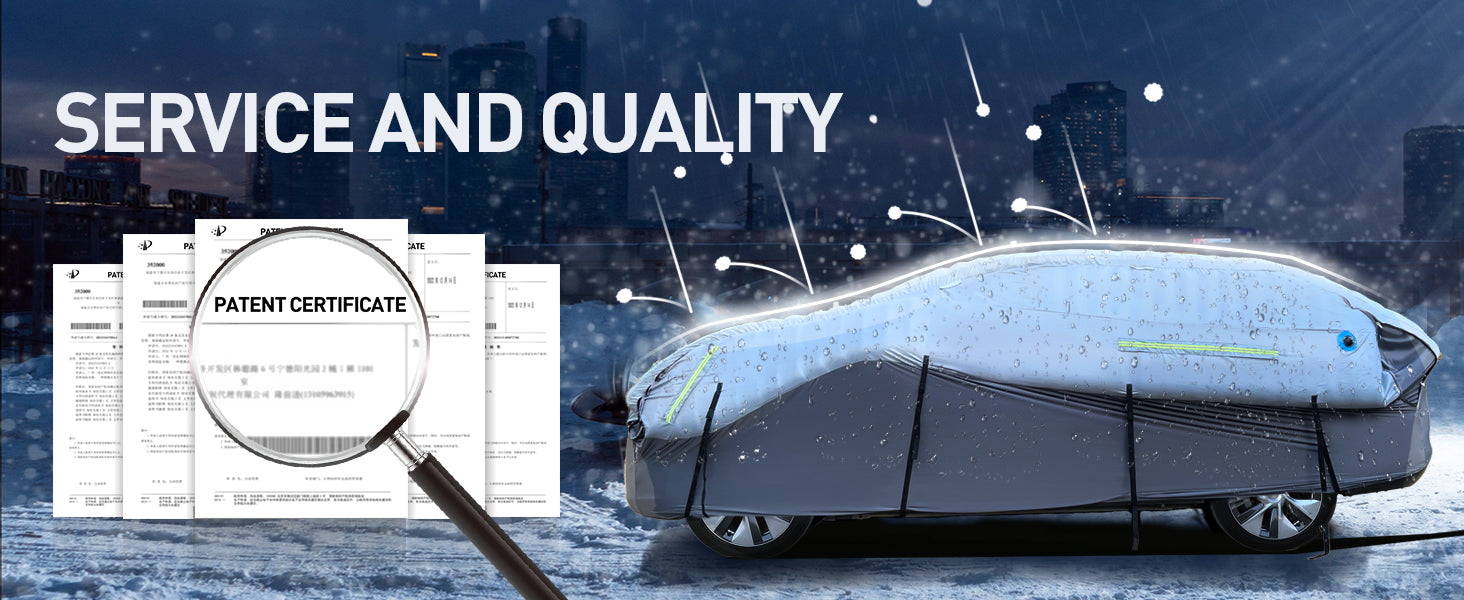 WARSUN's Hail Protector Car Cover is meticulously designed to shield your beloved vehicle from the perils of hail damage. Providing complete coverage for your car, including the windshield, hood, doors, and more, this patented product (Patent Number: ZL202223347804.8) ensures all-around protection. Counterfeits beware – we take patent infringement seriously.