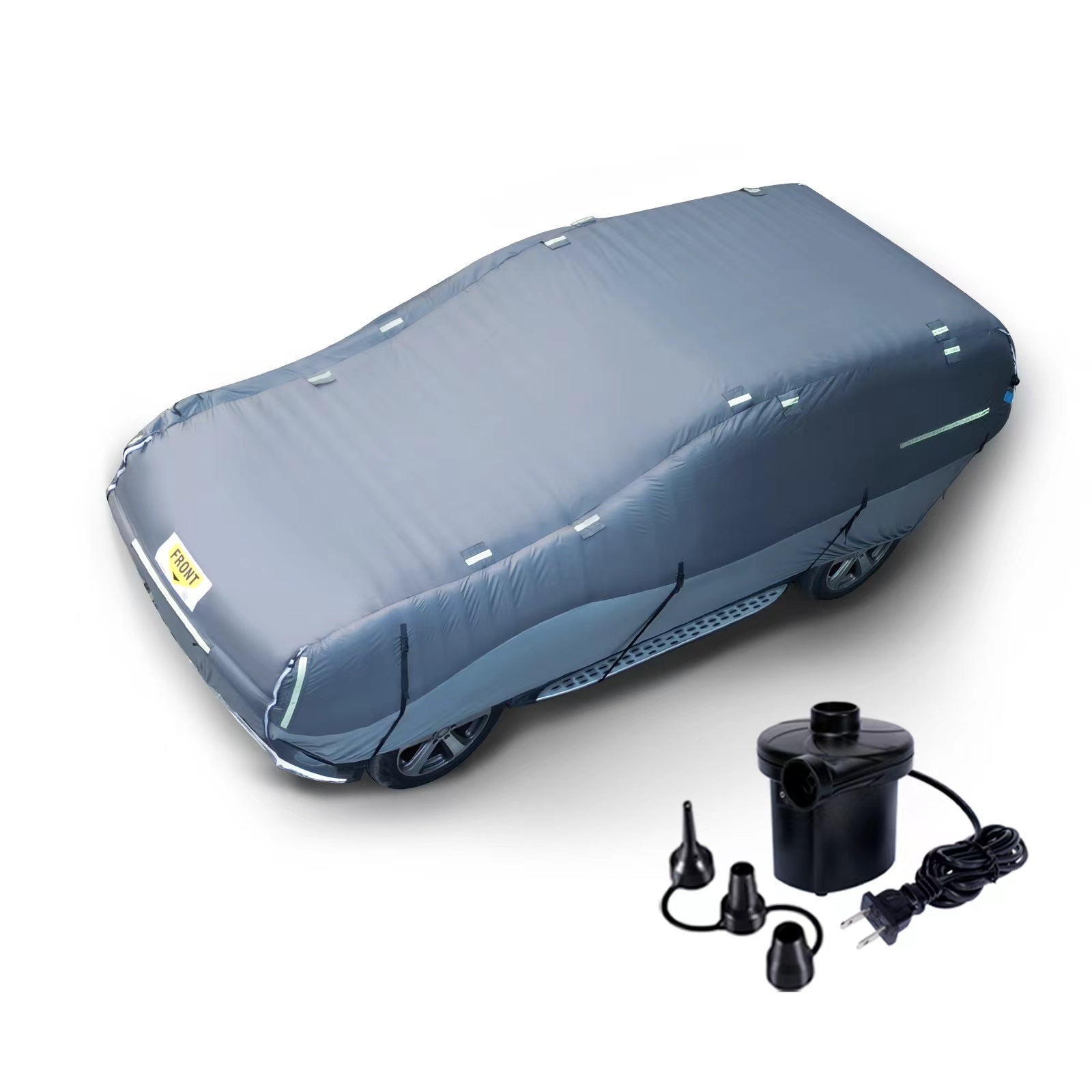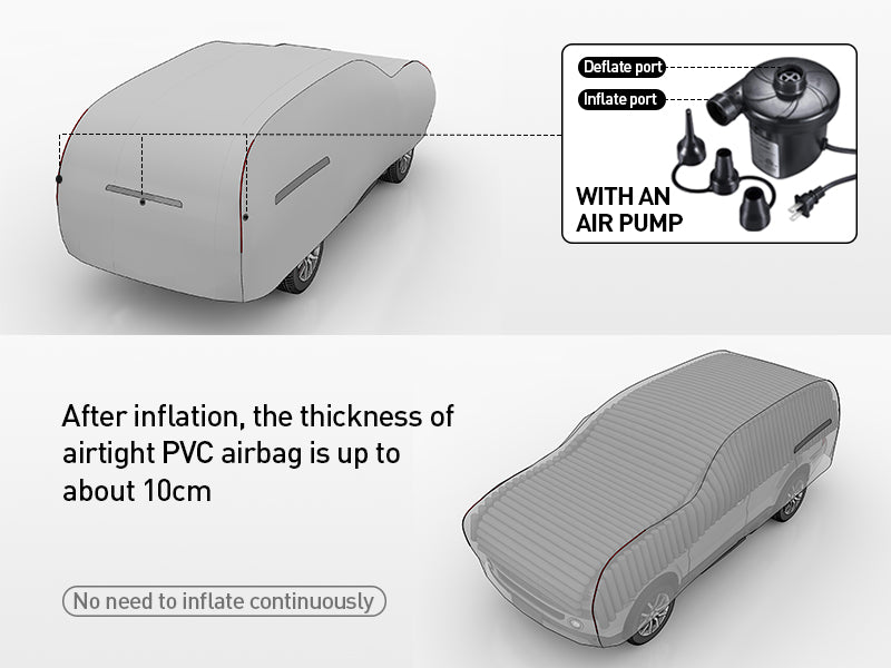 Our flexible front and rear zipper design adapts to most vehicles, with added reflective strips for enhanced nighttime visibility. Secure your hail proof cover with four straps and buckles, ready to face extreme winds. Compact and convenient, it easily folds into your trunk. Inflation and deflation are safe and simple with the included air pump.