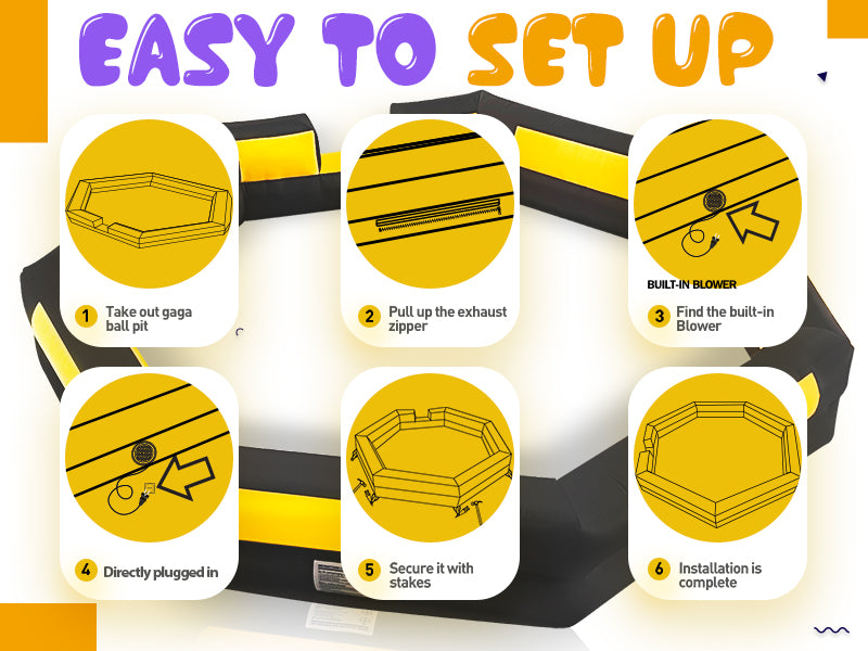 【Effortless Setup】Featuring a built-in powerful blower, there’s no need for an external fan—eliminating the risk of the blower being knocked over during intense matches. The pit inflates in just a few minutes and stays continuously inflated during use (ensure the zipper is secured before inflating). The built-in blower operates quietly with minimal noise, allowing you to fully enjoy the Gaga game without distractions.