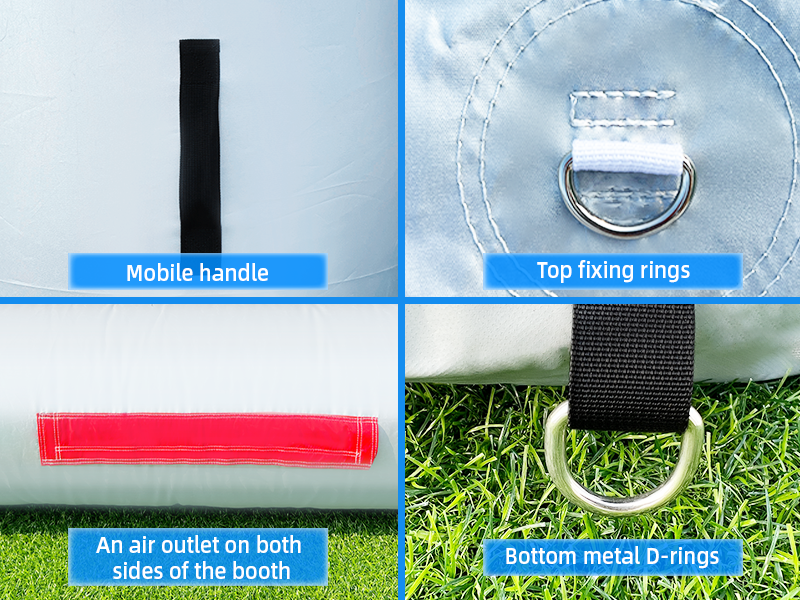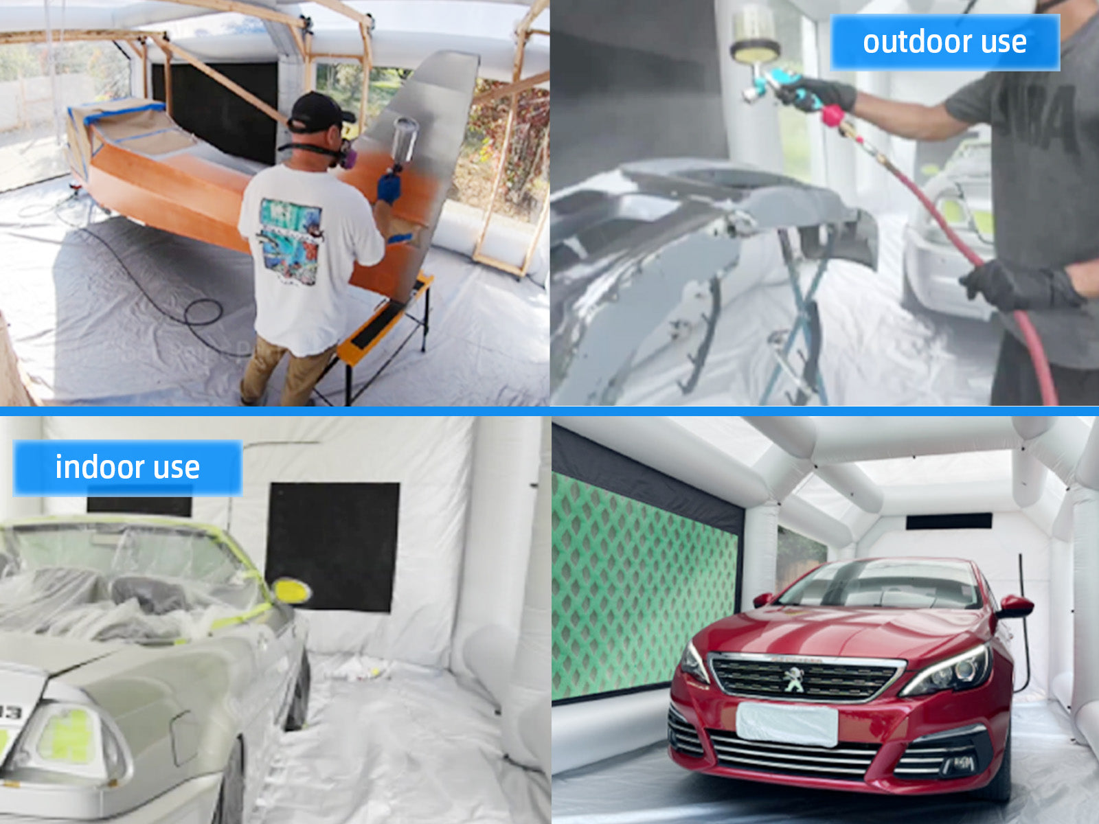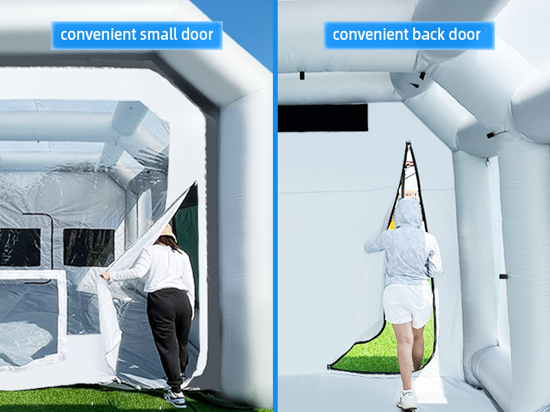 The smart design of our inflatable paint booth with convenient small doors at both the front and back doors gives you great convenience and flexibility in your work.