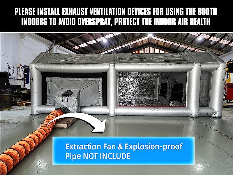 This paint booth is a portable and inflatable structure designed for spray painting small objects such as car parts, boats, or furniture. The booth is made of durable material, and is equipped with air filtration system to contain overspray. It can be easily set up and dismantled, making it ideal for use in outdoor and indoor.